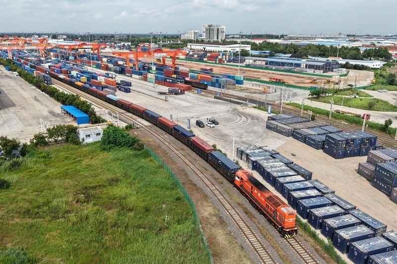 8月27日,一列貨運(yùn)列車駛?cè)胛挥谏虾鲜痉秴^(qū)內(nèi)的中國(guó)-上海合作組織地方經(jīng)貿(mào)合作示范區(qū)多式聯(lián)運(yùn)中心(無(wú)人機(jī)照片)。