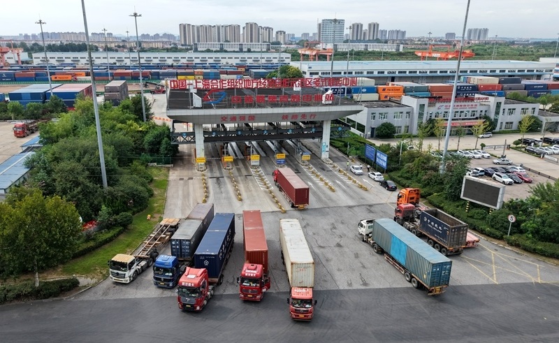 8月27日,貨運(yùn)卡車進(jìn)出位于上合示范區(qū)內(nèi)的中國(guó)-上海合作組織地方經(jīng)貿(mào)合作示范區(qū)多式聯(lián)運(yùn)中心(無(wú)人機(jī)照片)。