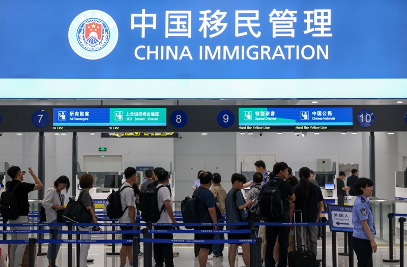 8月27日,在天津濱海國際機場T1航站樓,旅客排隊入境查驗。