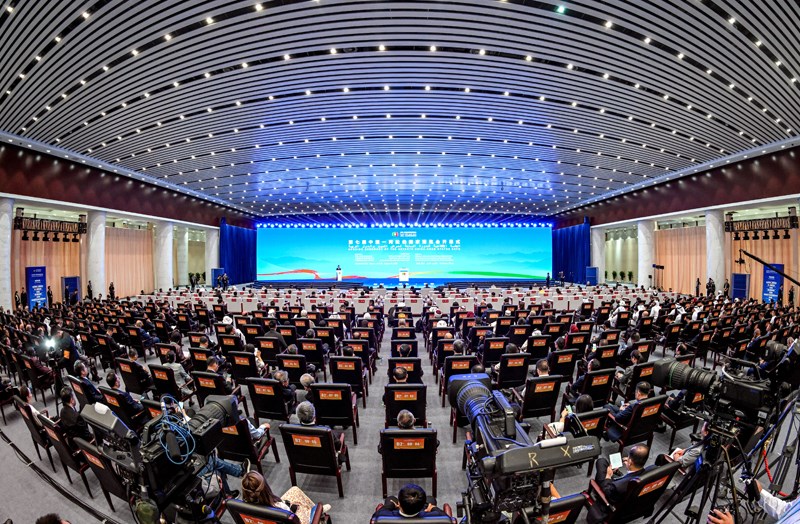 這是8月28日在寧夏銀川市拍攝的第七屆中國(guó)—阿拉伯國(guó)家博覽會(huì)開(kāi)幕式會(huì)場(chǎng)外景。