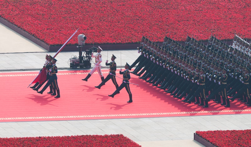 9月3日,紀(jì)念中國(guó)人民抗日戰(zhàn)爭(zhēng)暨世界反法西斯戰(zhàn)爭(zhēng)勝利80周年大會(huì)在北京隆重舉行。這是國(guó)旗護(hù)衛(wèi)隊(duì)在行進(jìn)中。
