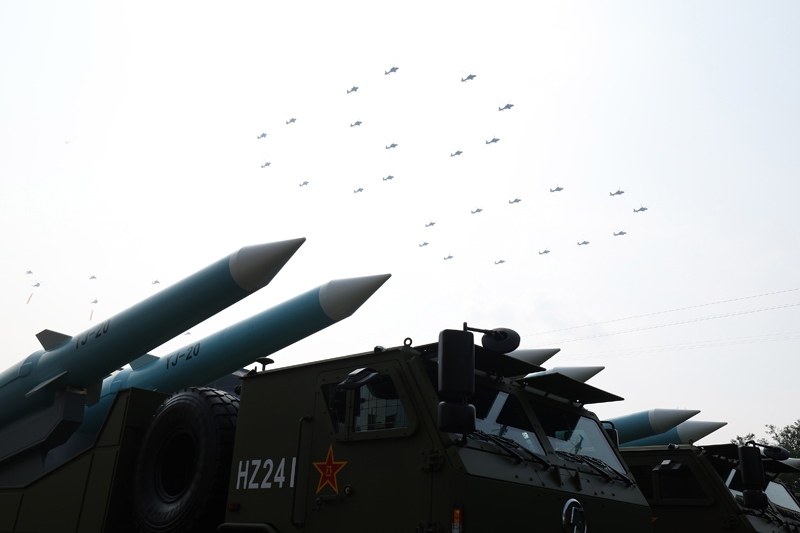 9月3日,紀(jì)念中國人民抗日戰(zhàn)爭暨世界反法西斯戰(zhàn)爭勝利80周年大會在北京隆重舉行。這是空中護(hù)旗梯隊(duì)從反艦導(dǎo)彈方隊(duì)上空飛過。