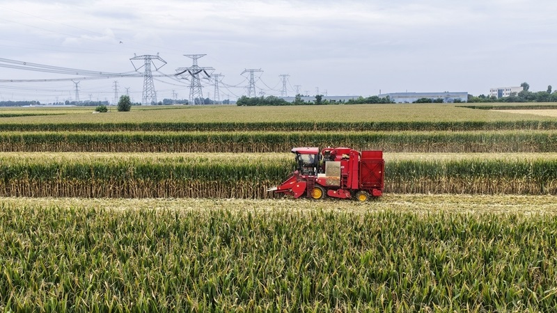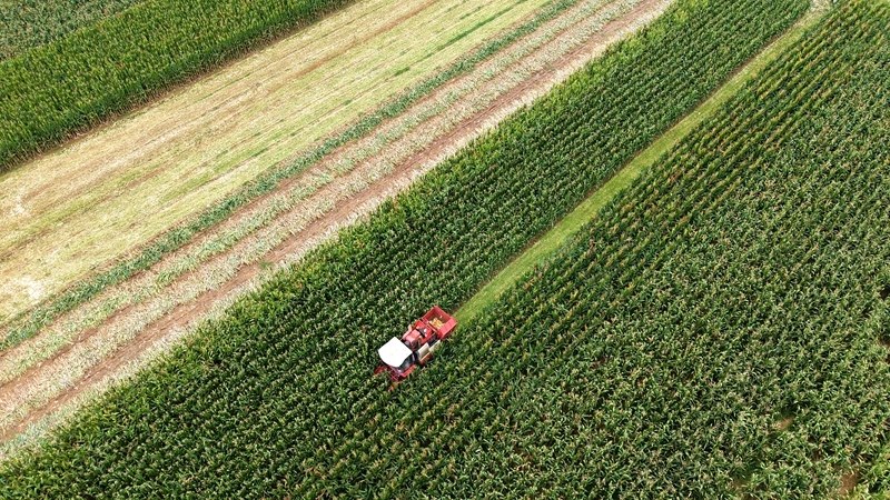 9月5日,農(nóng)民駕駛聯(lián)合收割機(jī)在山東省東營市廣饒縣李鵲鎮(zhèn)黃東村的高標(biāo)準(zhǔn)農(nóng)田收割玉米(無人機(jī)照片)。