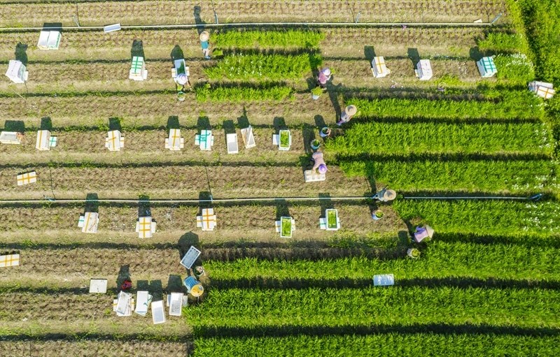 9月4日,農(nóng)民在江西省贛州市信豐縣大橋鎮(zhèn)青光村的韭菜田里采收韭菜(無人機(jī)照片)。