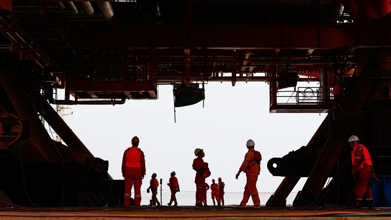 9月8日,工人穿梭在墾利6-1油田10-1北區(qū)塊Ⅱ期開發(fā)項(xiàng)目油氣平臺(tái)安裝作業(yè)現(xiàn)場(chǎng)。
