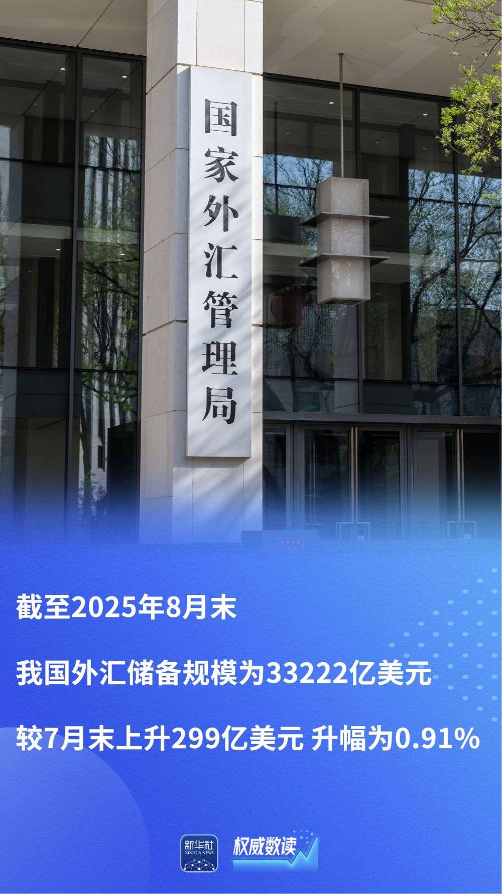 國(guó)家外匯管理局?jǐn)?shù)據(jù)顯示,截至2025年8月末,我國(guó)外匯儲(chǔ)備規(guī)模為33222億美元,較7月末上升299億美元,升幅為0.91%。