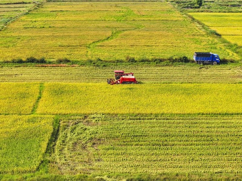 10月11日,湖南省衡陽市衡山縣白果鎮(zhèn)村民駕駛農機收割稻谷(無人機照片)。