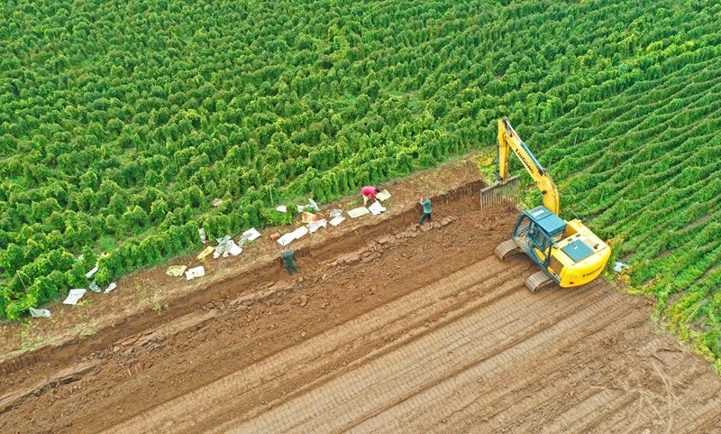 10月11日,河南省焦作市孟州市城伯鎮(zhèn)西后津村農民在田間搶收鐵棍山藥(無人機照片)。