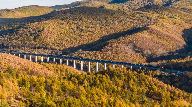 10月18日,一列滿載進(jìn)口物資的貨物列車駛向中國鐵路哈爾濱局集團(tuán)有限公司綏芬河站(無人機(jī)照片)。