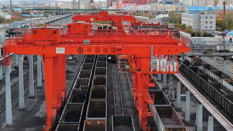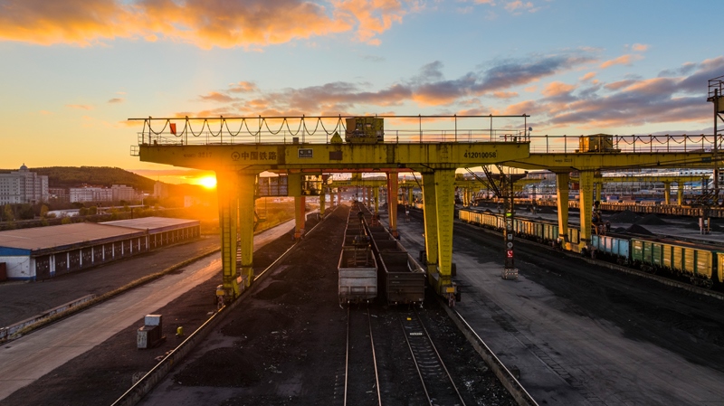 10月18日,在中國鐵路哈爾濱局集團(tuán)有限公司滿洲里站,機(jī)械化換裝場(chǎng)在對(duì)進(jìn)口貨物進(jìn)行換裝作業(yè)(無人機(jī)照片)。
