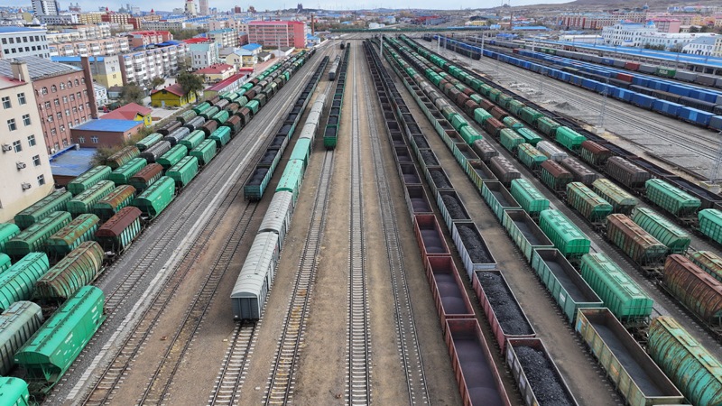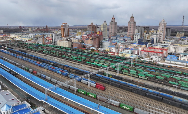 10月18日,在中國鐵路哈爾濱局集團(tuán)有限公司綏芬河站南場(chǎng),滿載進(jìn)口貨物的列車等待解體換裝(無人機(jī)照片)。