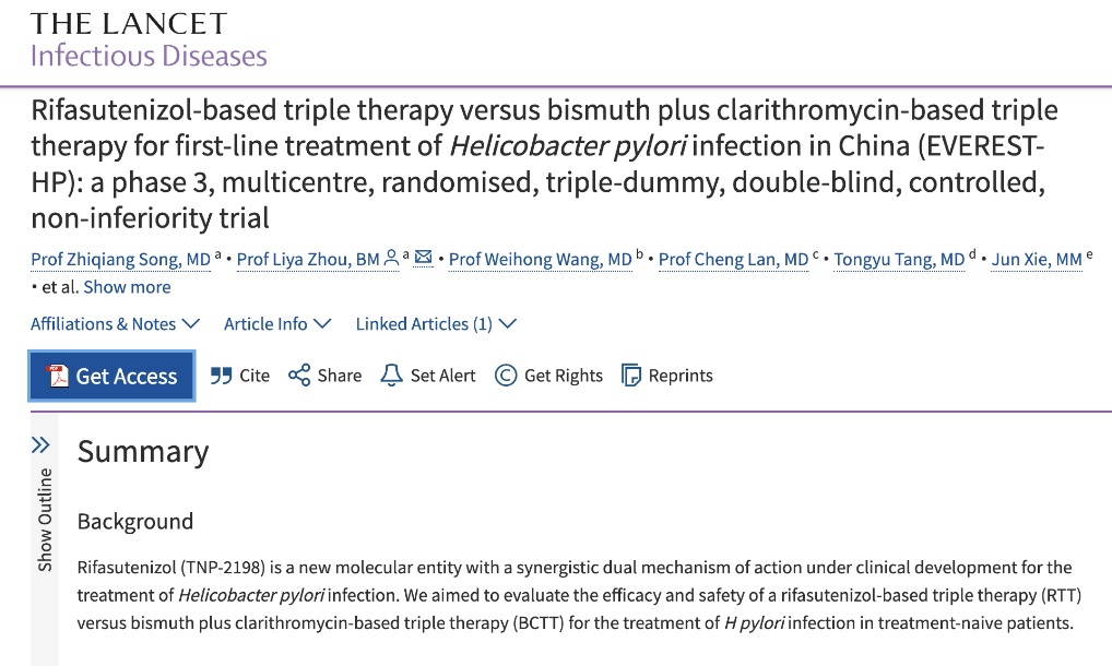 北京大學第三醫(yī)院消化科周麗雅、宋志強教授團隊帶領(lǐng)全國40家醫(yī)療機構(gòu)消化疾病診療中心,通過全球首個Ⅲ期臨床試驗,證實了含利福特尼唑的三聯(lián)方案,比臨床上常用的鉍劑四聯(lián)方案具有更高的根除成功率和更低的不良反應(yīng)發(fā)生率,而且用藥更少,服用更方便,將為全球幽門螺桿菌感染者帶來了全新的治療選擇。相關(guān)成果日前于《柳葉刀-感染病學》在線發(fā)表。