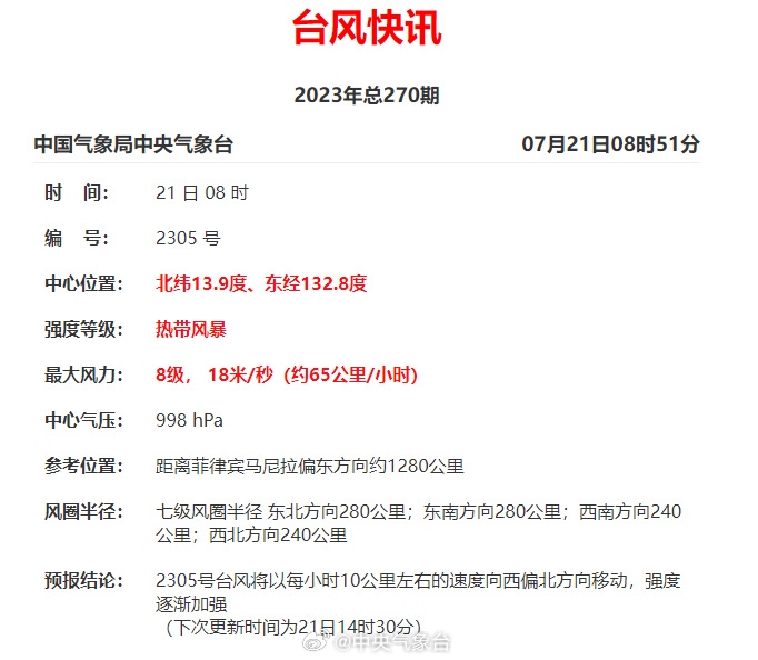 另外,今年第25號臺風“海鷗”(強熱帶風暴級)3日8時其中心位于北緯10.8度、東經(jīng)128.8度,也就是在距離菲律賓馬尼拉東偏南方向約950公里的西北太平洋洋面上,中心附近最大風力有11級(30米/秒)。