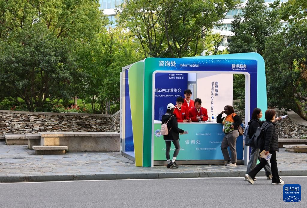11月3日,志愿者在國家會展中心(上海)的一個咨詢處內(nèi)工作。