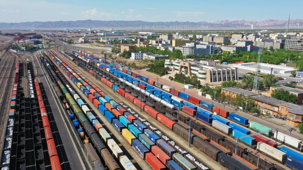 在新疆阿拉山口站寬準軌編組場,出入境中歐班列集結等待出發(fā)(2024年5月25日攝,無人機照片)。新華社發(fā)(于暉 攝)