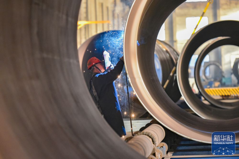 ↑ 12月15日,在山東省青州市益都街道一家大型風(fēng)電設(shè)備制造企業(yè),工人在車間內(nèi)進(jìn)行焊接作業(yè)。新華社發(fā)(王繼林?jǐn)z)