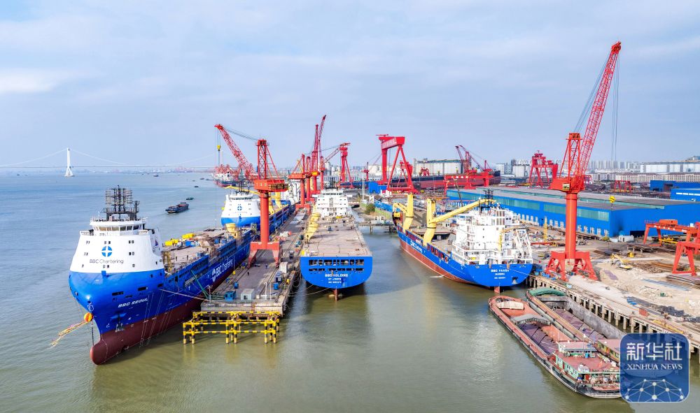 ↑ 12月15日,在江蘇南京招商工業(yè)南京金陵船廠生產(chǎn)廠區(qū),大型船舶在建造中(無人機(jī)照片)。新華社發(fā)(辛一攝)