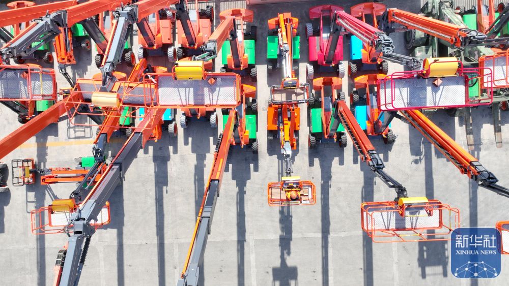 ↑ 12月15日,在位于浙江省湖州市德清縣雷甸鎮(zhèn)的浙江鼎力機(jī)械股份有限公司,工人對(duì)準(zhǔn)備出口的新臂式智能高空作業(yè)平臺(tái)設(shè)備進(jìn)行檢測(cè)(無人機(jī)照片)。新華社發(fā)(謝尚國攝)
