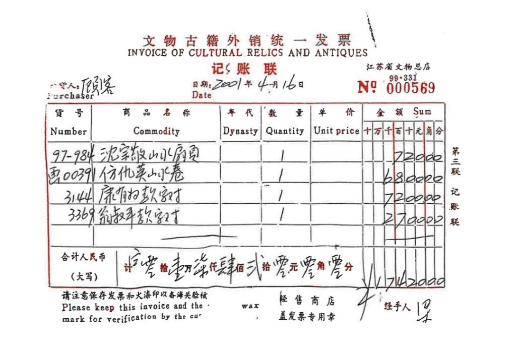 原江蘇省文物總店銷售發(fā)票顯示,《仿仇英山水卷》于2001年4月16日被“顧客”以6800元價(jià)格購(gòu)買。(受訪者供圖)
