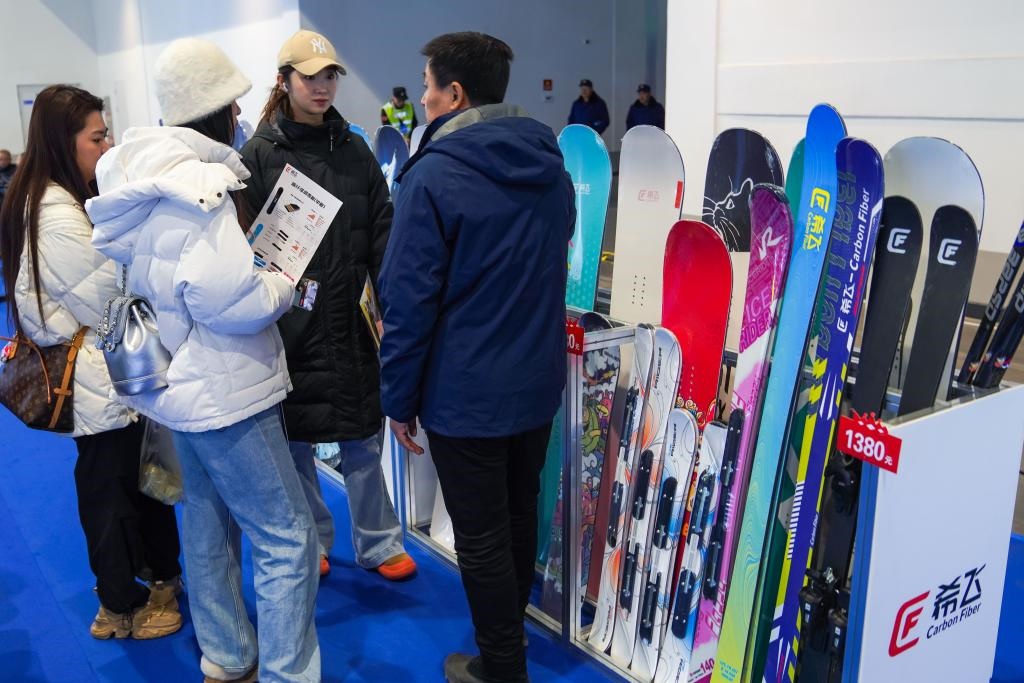 12月18日,參觀(guān)者在第九屆吉林冰雪產(chǎn)業(yè)國(guó)際博覽會(huì)現(xiàn)場(chǎng)參觀(guān)展出的國(guó)產(chǎn)碳纖維滑雪板。新華社記者 許暢 攝