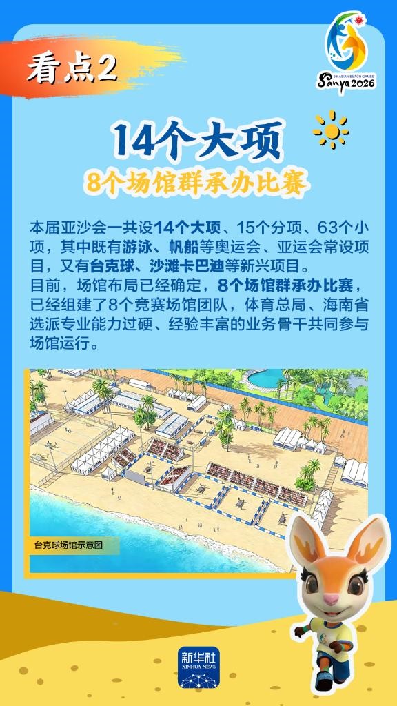 第六屆亞洲沙灘運動會(以下簡稱“亞沙會”)將于2026年4月22日至30日在海南三亞舉行,賽事歷時9天。作為海南自由貿(mào)易港封關(guān)運作后迎來的首個國際大型綜合性體育盛事,亞沙會都有哪些看點?為何值得期待?國新辦12日發(fā)布會做了詳細(xì)介紹,一起來看。