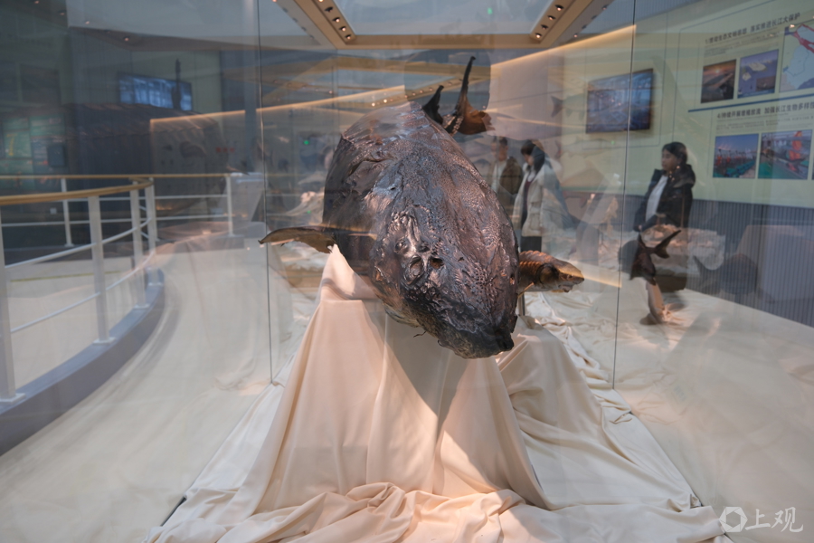 水野中心內(nèi)科普館的“鎮(zhèn)館之寶”,是一尾中華鱘標本。它長3.5米,重350公斤。2007年7月17日在金山區(qū)杭州灣水域誤入漁網(wǎng)受傷,經(jīng)全力救治成功存活1232天,在2010年12月1日死亡,創(chuàng)下當時國內(nèi)搶救救治中華鱘最長存活紀錄 郜陽 攝