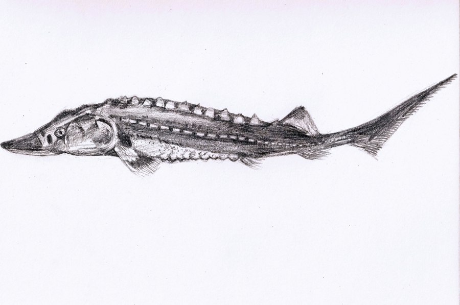 中華鱘生長較快,體型碩大,最大個體體長可達4米,體重可達680千克,最長壽命可達40齡以上 上海海洋大學學生手繪