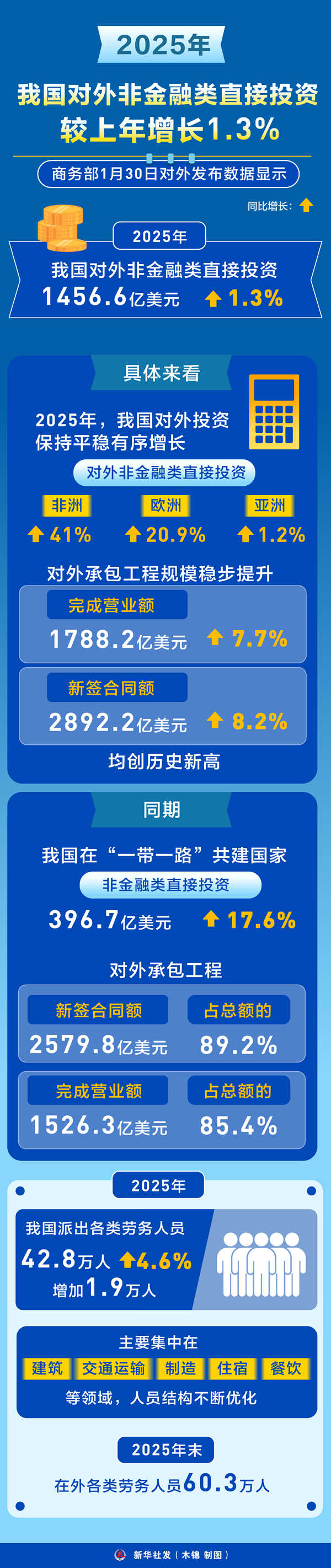 具體來(lái)看,2025年,我國(guó)對(duì)外投資保持平穩(wěn)有序增長(zhǎng),對(duì)非洲、歐洲、亞洲非金融類直接投資分別增長(zhǎng)41%、20.9%和1.2%;對(duì)外承包工程規(guī)模穩(wěn)步提升,完成營(yíng)業(yè)額1788.2億美元,較上年增長(zhǎng)7.7%,新簽合同額2892.2億美元,較上年增長(zhǎng)8.2%,均創(chuàng)歷史新高。