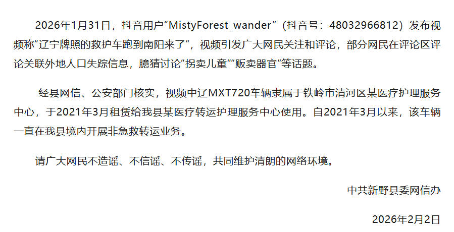 中國(guó)網(wǎng)2月2日訊 據(jù)“新野發(fā)布”微信公眾號(hào)消息,2月2日上午,河南省南陽(yáng)市新野縣委網(wǎng)信辦發(fā)布情況說(shuō)明稱,2026年1月31日,抖音用戶“MistyForest_wander”(抖音號(hào):48032966812)發(fā)布視頻稱“遼寧牌照的救護(hù)車跑到南陽(yáng)來(lái)了”,視頻引發(fā)廣大網(wǎng)民關(guān)注和評(píng)論,部分網(wǎng)民在評(píng)論區(qū)評(píng)論關(guān)聯(lián)外地人口失蹤信息,臆猜討論“拐賣兒童”“販賣器官”等話題。