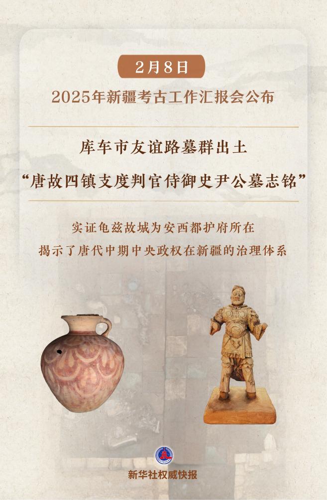 2月8日在京舉行的2025年新疆考古工作匯報會上,公布了庫車市友誼路墓群等“實證歷代中央政權(quán)有效管轄治理新疆”考古新發(fā)現(xiàn)。