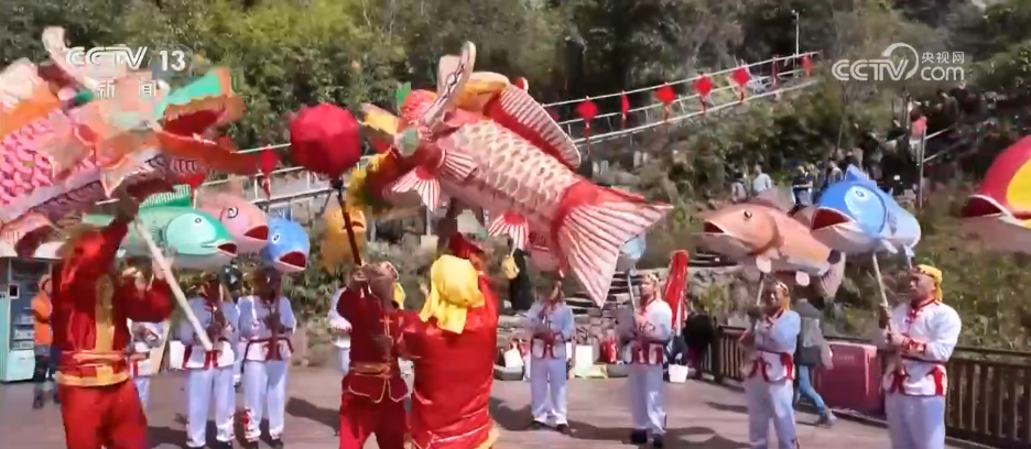 記者身后的九鯉湖景區(qū),湖光山色、層巒疊翠,展現(xiàn)出南方山岳特有的靈秀。景區(qū)里最熱門的打卡點之一,叫做“一線天”。這里最窄處不到30厘米,一次只能容一人貼壁通過,游客需要側身慢慢穿行,在狹窄石縫間體驗攀登的樂趣。記者身旁正在巡游的就是當?shù)氐姆沁z——店下魚燈。大家看,一盞盞彩繪魚燈隨著隊伍前進上下擺動,像魚兒在水里游,特別靈動。在過去,漁民會用魚燈祈愿出海平安、豐衣足食。過年的時候看魚燈,也寓意“年年有余、風調(diào)雨順”。