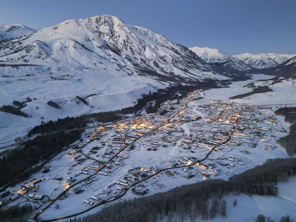 夜幕降臨,新疆阿勒泰將軍山國(guó)際滑雪度假區(qū)即將開啟夜場(chǎng)運(yùn)營(yíng)(2025年1月24日攝,無人機(jī)照片)。新華社記者 胡虎虎 攝