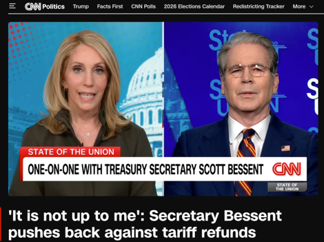 還有一個(gè)更現(xiàn)實(shí)的“回避點(diǎn)”:貝森特在鏡頭前把退款說成“不是關(guān)鍵問題”,這其實(shí)是在把政治風(fēng)險(xiǎn)與財(cái)政風(fēng)險(xiǎn)同時(shí)后推。因?yàn)橐坏┏姓J(rèn)“應(yīng)該退”,接下來就會面臨三個(gè)更尖銳的問題:退給誰?退多少(含不含利息)?退款的錢從哪里出?這些都不是一句“等法院”就可以遮過去的。當(dāng)天,多家媒體引述貝森特接受采訪時(shí)的表述,稱“退款由下級法院處理”,這與其說是法律判斷,不如說是政治姿態(tài),即在不承諾的前提下,把主動權(quán)留給時(shí)間。