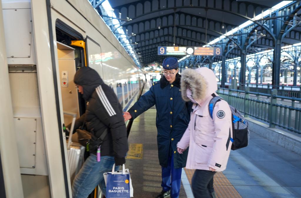 中國鐵路哈爾濱局集團(tuán)有限公司工作人員(中)在哈爾濱火車站為旅客服務(wù)。李昕洋 攝