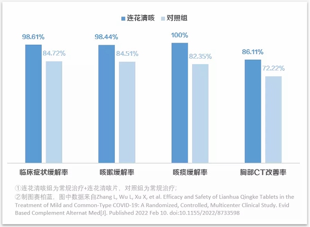 具體來(lái)看,與常規(guī)治療組相比,使用了連花清咳片的患者在咳嗽、咳痰緩解率以及胸部CT改善率方面均有更好的表現(xiàn),同時(shí),緩解時(shí)間也有所提前,且無(wú)不良反應(yīng)事件。