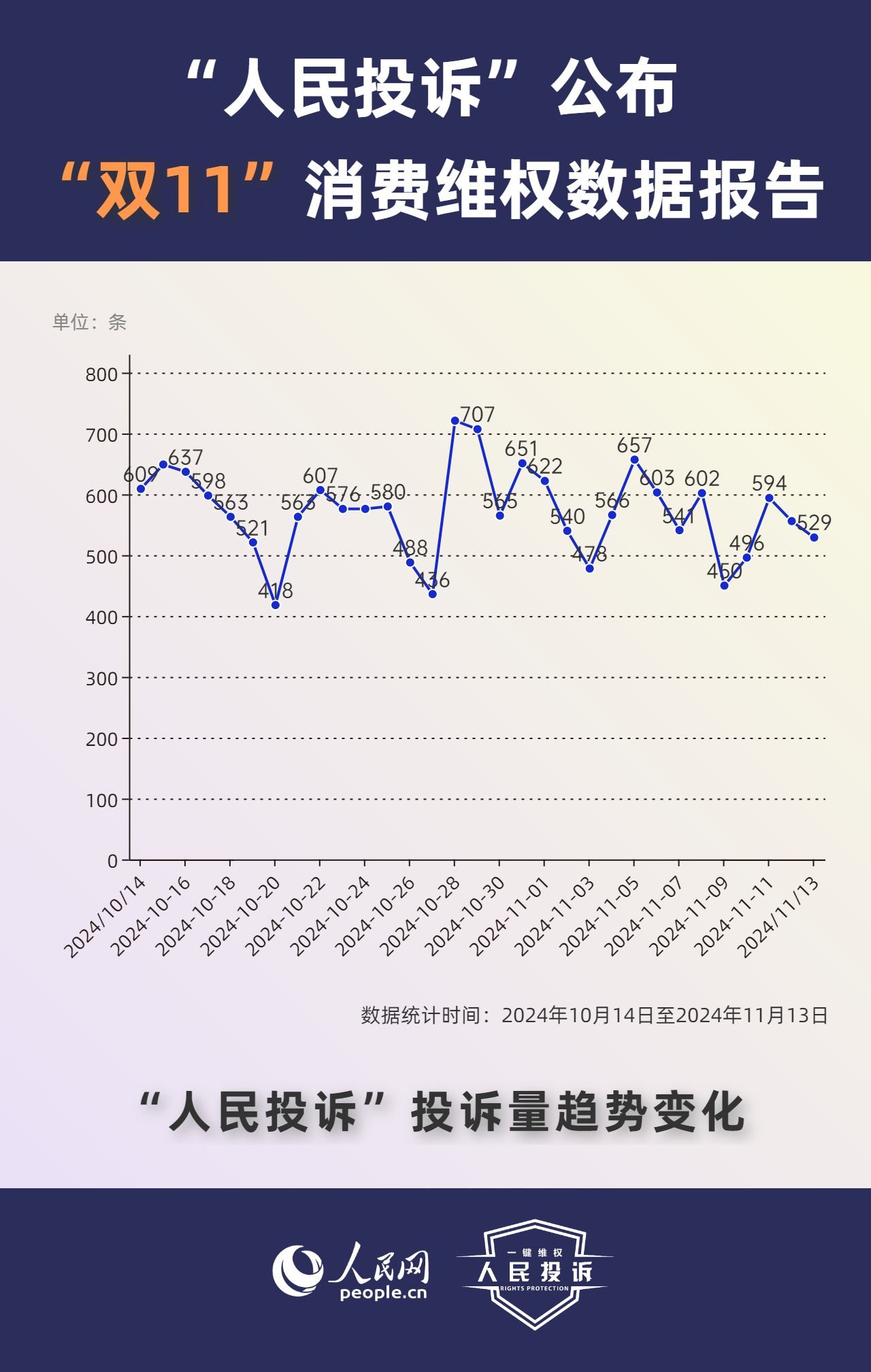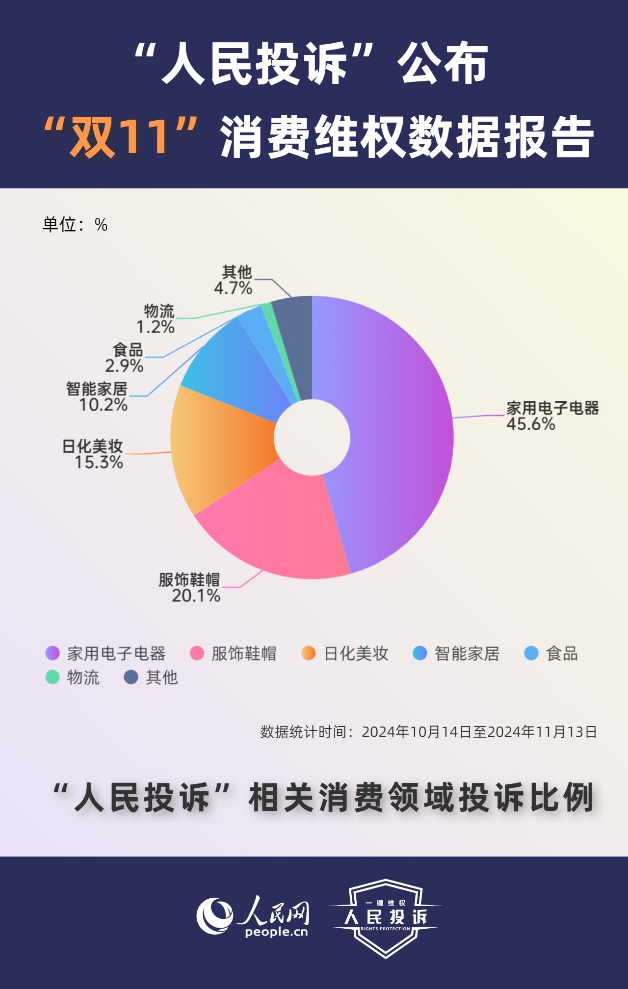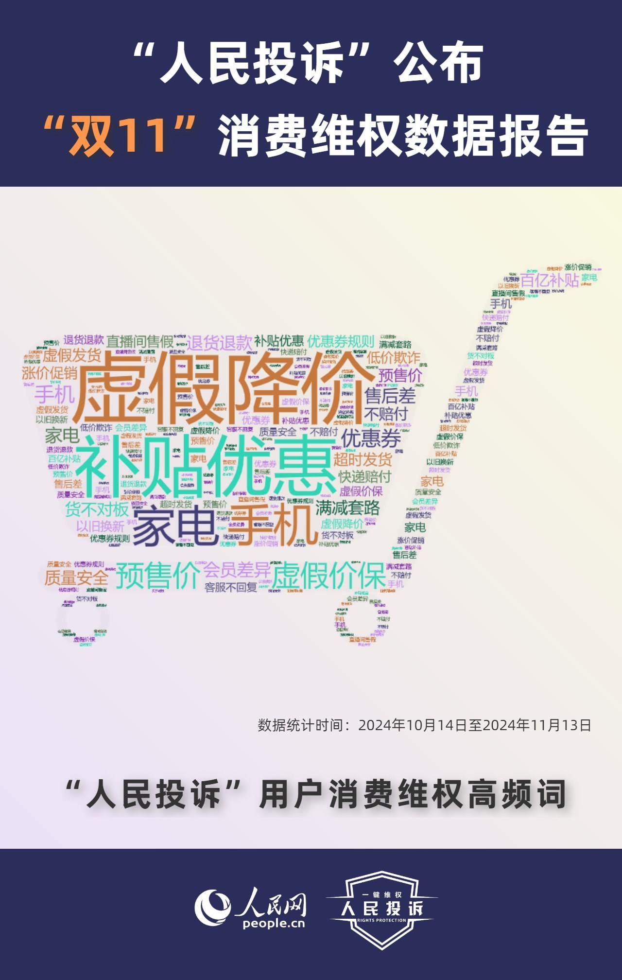 那么,今年你的“雙11”購物還遇到了哪些“套路”?據(jù)人民網(wǎng)“人民投訴”平臺統(tǒng)計,“雙11”期間平臺共收到17699條(數(shù)據(jù)統(tǒng)計從2024年10月14日-11月13日)投訴信息。其中,手機(jī)、家電、智能產(chǎn)品、美妝服飾等消費領(lǐng)域維權(quán)量大;平臺“國補”“以舊換新”等優(yōu)惠規(guī)則不透明,保價服務(wù)藏“貓膩”,直播間虛假“破價”,“百億補貼”商品貨不對板,“高價預(yù)售”欺詐等問題反映突出。