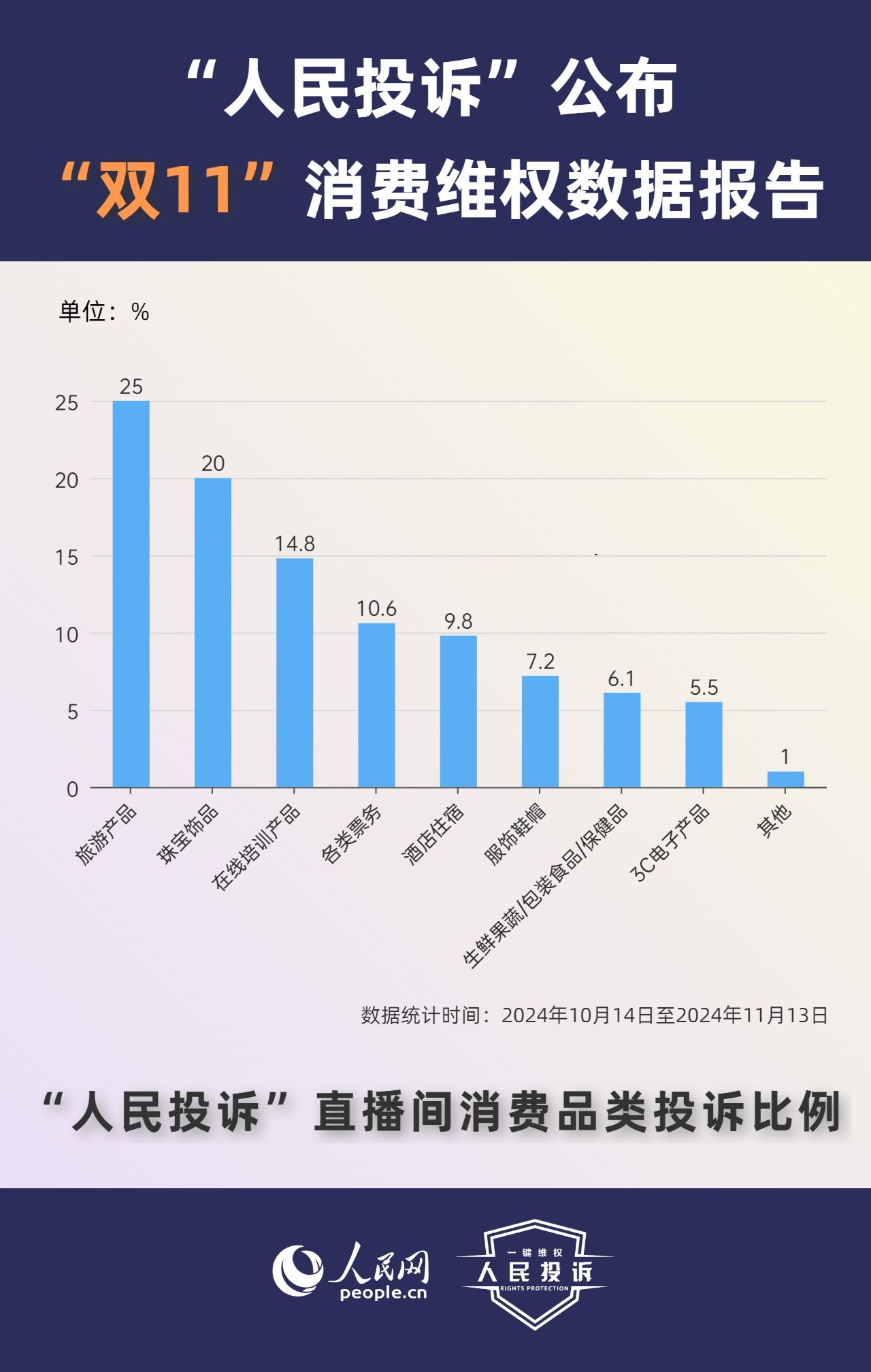今年“雙11”前夕,人民網(wǎng)“人民投訴”平臺聯(lián)合人民日報“讀者來信”版發(fā)起規(guī)范“直播帶貨”問題建議征集活動。平臺數(shù)據(jù)顯示,活動上線以來,網(wǎng)友通過各渠道的相關(guān)留言量已超千條?!叭嗣裢对V”分析發(fā)現(xiàn),網(wǎng)友投訴直播消費多集中在預(yù)付費式旅游產(chǎn)品、在線培訓(xùn)產(chǎn)品、珠寶飾品、服裝鞋帽、電子產(chǎn)品、生鮮食品、酒店服務(wù)、娛樂演出票務(wù)、寵物買賣等消費品類。其中,旅游套餐投訴占比25%,珠寶飾品交易投訴占比20%,在線培訓(xùn)投訴占比14.8%,各類票務(wù)投訴占比10.6%,酒店住宿投訴占比9.8%,服飾帽類商品投訴占比7.2%,生鮮果蔬/包裝食品/保健品投訴占比6.1%,3C電子產(chǎn)品投訴占比5.5%。