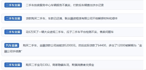 “拍賣服務(wù)中心車輛報(bào)告不真實(shí),付款后查出車輛涉水記錄”“車款已付清,融資租賃公司卻遲遲不給解押材料和綠本”“商家欺騙消費(fèi)者交押金”“試駕階段就出現(xiàn)安全隱患,商家隱瞞車況強(qiáng)買強(qiáng)賣不退車”“檢測作假,售后不作為,不按合同約定處理”……在人民網(wǎng)“人民投訴”平臺上,近期有不少二手車交易亂象的投訴,具體問題大多聚焦于——