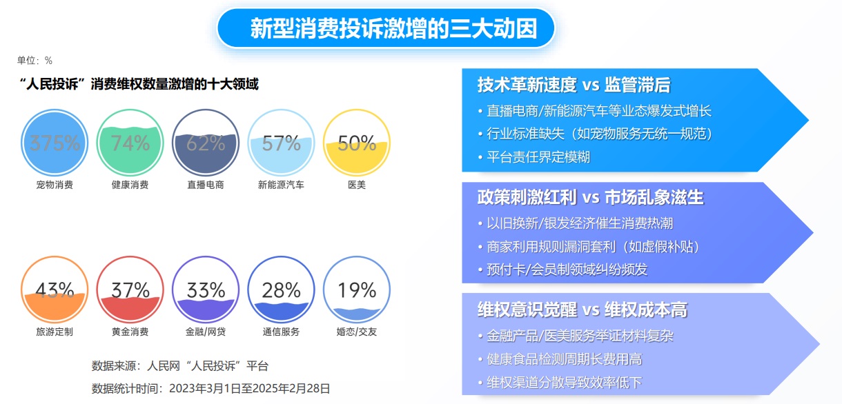 “人民投訴”綜合分析,技術(shù)驅(qū)動(dòng)新業(yè)態(tài)與監(jiān)管未能同步、政策刺激紅利與市場亂象并存、維權(quán)意識(shí)提升與維權(quán)成本矛盾這三大因素共同成為推高新型消費(fèi)領(lǐng)域風(fēng)險(xiǎn)的原因。