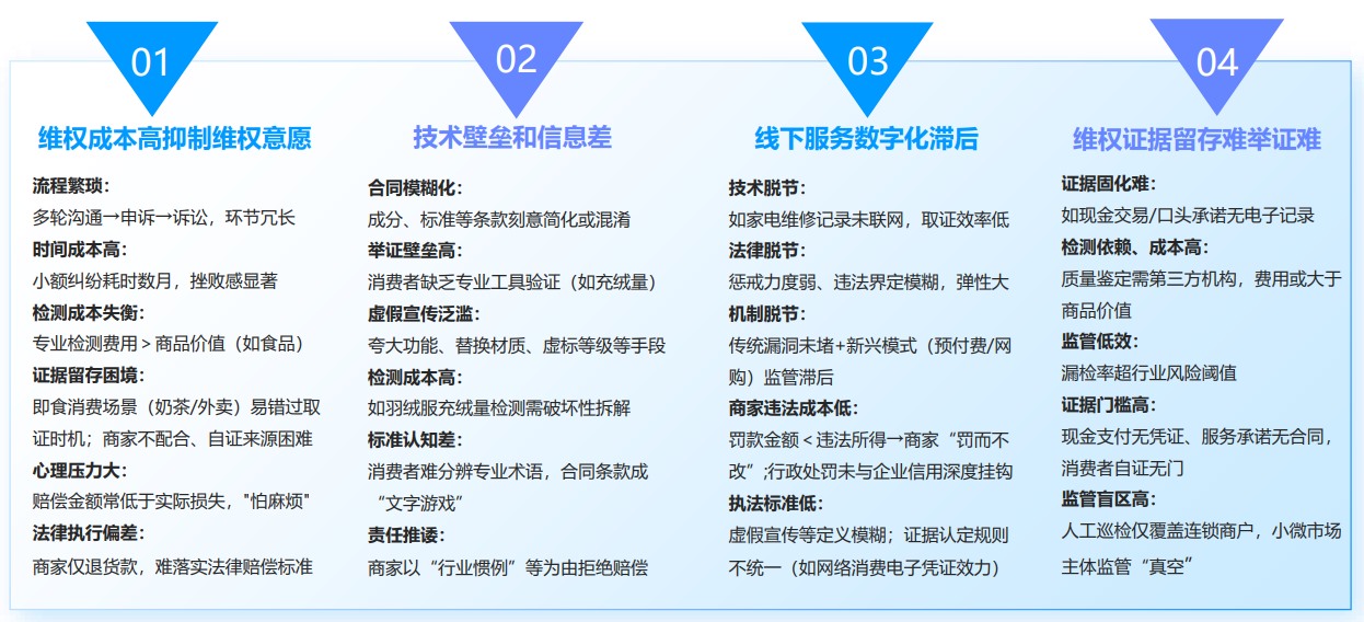 通過對(duì)消費(fèi)維權(quán)新老問題的梳理和分析,“人民投訴”認(rèn)為,傳統(tǒng)問題多因信息不對(duì)稱和監(jiān)管漏洞,而新難題則疊加了技術(shù)復(fù)雜性(如算法操控)和新業(yè)態(tài)模式(如直播、盲盒),維權(quán)難度升級(jí)。