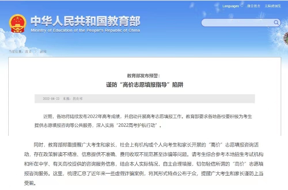 近日,教育部發(fā)布預(yù)警,提醒考生謹(jǐn)防“高價志愿填報指導(dǎo)”陷阱。有網(wǎng)站虛假宣傳擁有所謂“內(nèi)部信息”,自稱掌握內(nèi)部大數(shù)據(jù),能夠“精準(zhǔn)定位院?!钡鹊取J聦?shí)上,每年高考填報志愿前,各省級招生考試機(jī)構(gòu)都會發(fā)布當(dāng)年高考成績統(tǒng)計情況和近年來各高校錄取分?jǐn)?shù)情況,并不存在市面上的咨詢機(jī)構(gòu)或個人聲稱的“內(nèi)部信息”。還有一些咨詢機(jī)構(gòu)假冒所謂志愿填報專家身份。該咨詢機(jī)構(gòu)打出廣告,稱團(tuán)隊的專家“獲得高考志愿規(guī)劃師認(rèn)證”“來自著名高?!钡?。事實(shí)上,有關(guān)部門從未發(fā)放過“高考志愿規(guī)劃師”這類職業(yè)資格證書。該機(jī)構(gòu)一些所謂“志愿規(guī)劃師”都是臨時招募的社會人員,按照總部提供的“臺詞”給考生和家長輔導(dǎo)。家長購買這些機(jī)構(gòu)的服務(wù)不僅花了冤枉錢,而且可能報錯志愿?! ?/p>