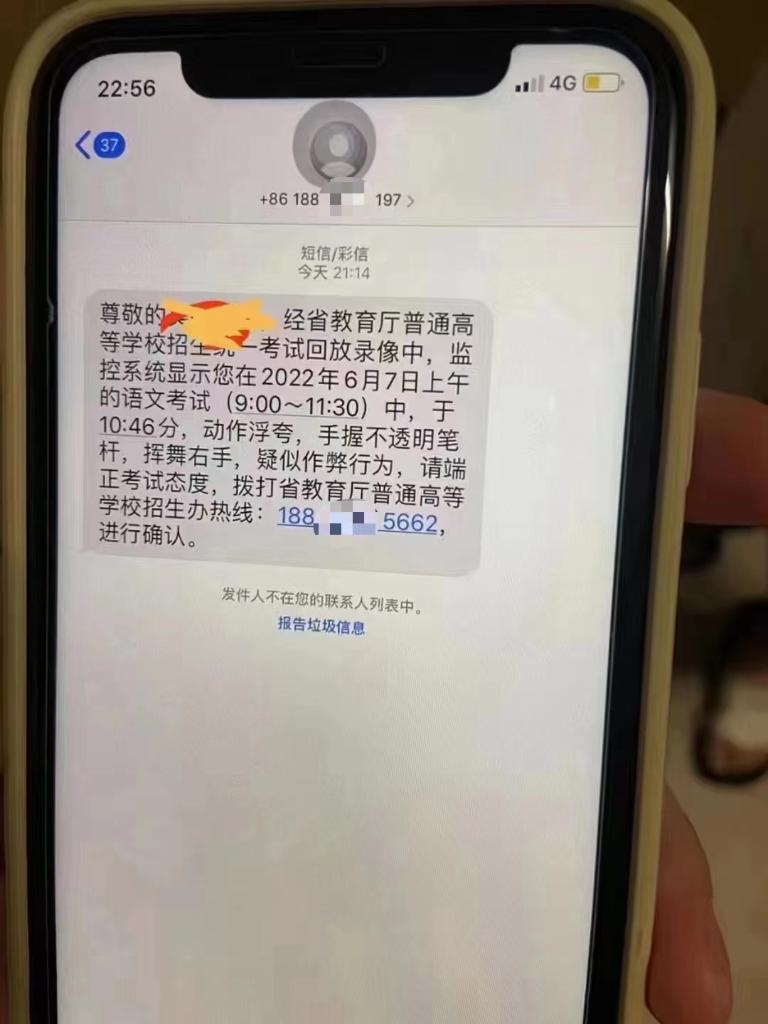 “尊敬的考生×××,經(jīng)省教育廳普通高等學(xué)校招生統(tǒng)一考試回放錄像中,監(jiān)控系統(tǒng)顯示您在2022年6月7日上午的語文考試(9:00—11:30)中,于10時46分,動作浮夸,手握不透明筆桿,揮舞右手,疑似作弊行為,請端正考試態(tài)度,撥打省教育廳普通高等學(xué)校招生辦熱線:188×××進(jìn)行確認(rèn)?!苯?,有考生向廈門警方反映,自己接到了聲稱是“省教育廳普通高等學(xué)校招生辦”的通知短信,懷疑是詐騙信息。該短信在開頭準(zhǔn)確寫明了考生姓名,并在結(jié)尾要求考生主動撥電話號碼進(jìn)行確認(rèn)。經(jīng)與教育部門核實(shí)確認(rèn),高考作弊違規(guī)行為不會以短信、電話、鏈接等方式通知。廈門警方提醒,不法分子通過非正常渠道搜集到考生信息,并向考生發(fā)送所謂“疑似作弊”的通知短信,考生一旦回?fù)茈娫?,就可能被不法分子以“處理作弊行為”為由?shí)施詐騙?! ?/p>