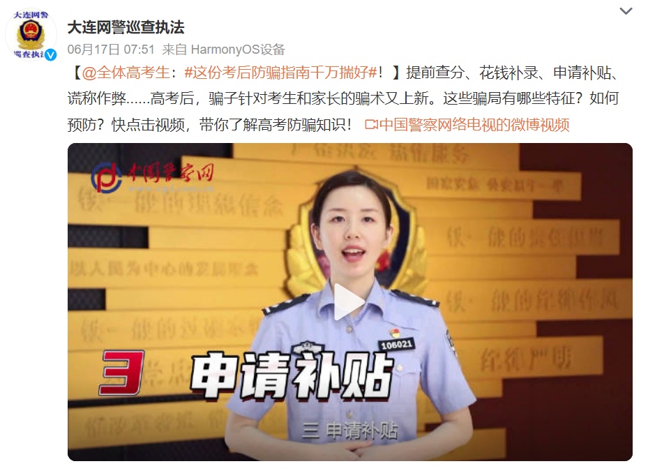 警方提醒廣大考生及考生家長,不管詐騙手段如何演變,萬變不離其宗的“核心需求”就是“要錢”,因此在收到此類短信或電話時,應(yīng)第一時間與學(xué)校、教育部門核實(shí),在無法確認(rèn)信息真實(shí)性的情況下,可撥打96110咨詢或舉報。此外,不要抱有僥幸心理,任何打著有“內(nèi)部名額”或“內(nèi)部渠道”的旗號要求繳納費(fèi)用的通知均為詐騙。