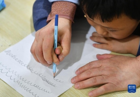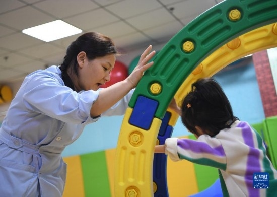 3月30日,在西安市金色陽光康復(fù)中心,特教老師(左)指導(dǎo)孩子進(jìn)行康復(fù)訓(xùn)練。
