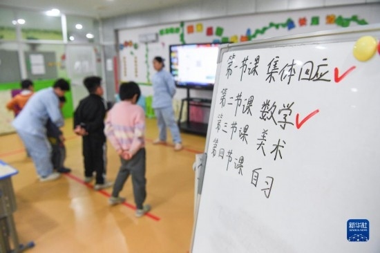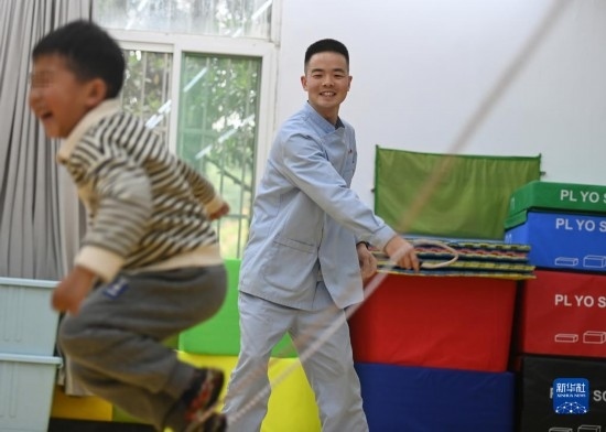 3月30日,在西安市金色陽光康復(fù)中心,孩子們在特教老師的保護(hù)下進(jìn)行康復(fù)訓(xùn)練。
