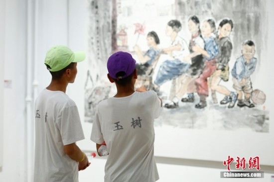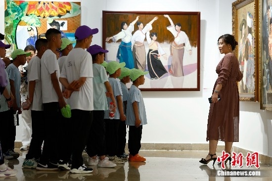 圖為藏族青少年們參觀美術(shù)館。中新社記者 富田 攝