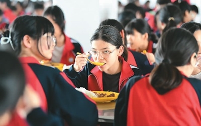 近年來,安徽省阜陽市阜南縣各配備有營養(yǎng)餐的學(xué)校嚴(yán)把食品衛(wèi)生關(guān),讓學(xué)生的營養(yǎng)餐真正成為陽光餐、幸福餐。圖為5月17日,阜南縣黃崗鎮(zhèn)靳成學(xué)校的學(xué)生們在食堂吃午飯。 呂乃明攝(人民視覺)