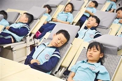 近年來,河北省邯鄲市復(fù)興區(qū)先后投入360余萬元,購置躺式桌椅、固定床、折疊床、睡墊,解決孩子餐后睡眠的難題。圖為5月29日,在復(fù)興區(qū)百花第二小學(xué),學(xué)生們使用“躺式課桌椅”午休。 郝群英攝(人民視覺)