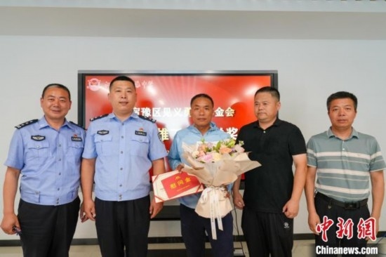 宿遷市公安局宿豫分局和宿豫區(qū)見(jiàn)義勇為基金會(huì)為丁成闖送上見(jiàn)義勇為表彰證書和慰問(wèn)金。宿豫區(qū)委宣傳部供圖