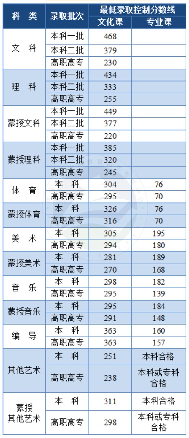 內(nèi)蒙古普通高考最低錄取控制分數(shù)線
